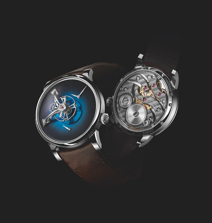 Dadurch lassen sich die von H. Moser & Cie. entlehnten Fumé-Zifferblätter vollkommen frei präsentieren, während ihre Ausdruckskraft durch eine raffinierte Lünette noch weiter verstärkt wird. Für das Modell LM101 MB&F x H. Moser wurden in den Farbgestaltungen Red Fumé, Cosmic Green Fumé, Aqua Blue Fumé und natürlich der berühmten Funky Blue Fumé gleich vier verschiedene FuméZifferblätter ausgewählt. Das mit einem gewölbten Saphirglas gekrönte Gehäuse ist erst zum dritten Mal in der Geschichte von MB&F aus Stahl gefertigt. Die faszinierende grosse, aufgehängte Unruh steht weiterhin im Mittelpunkt, wenngleich sie für die LM101 MB&F x H. Moser vollkommen neu gestaltet wurde, um die Schönheit der Fumé-Zifferblätter hervorzuheben.
